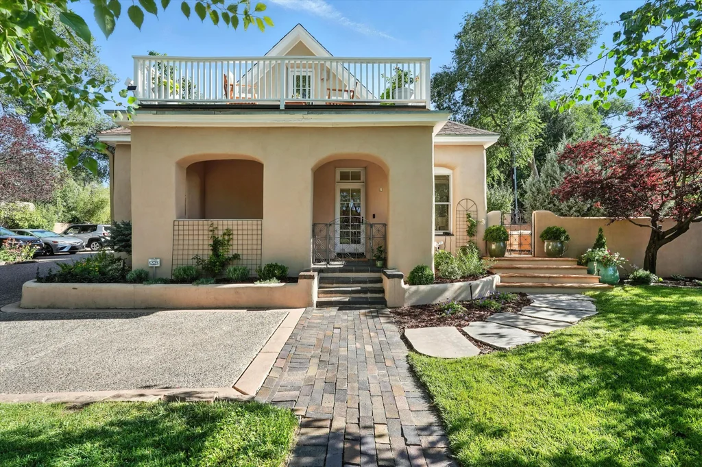 Just moments from Santa Fe's historic Plaza and Canyon Road, this 3 bedroom, 2 bath home embodies refined Southwestern elegance. Masterfully reimagined by Bergman Vass Interiors, it blends contemporary sophistication with the warmth of Santa Fe's timeless style. Every detail reflects exceptional craftsmanship with no surface left untouched! New energy-efficient windows and custom glass doors bathe rich hardwood floors in natural light. Recessed lighting highlights the home's architectural beauty, while landscaped gardens, an upstairs deck and flagstone patios create a serene outdoor retreat. A hand-forged gate, custom fireplace screen, and luxurious closets complete this remarkable residence.