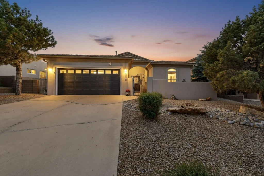Exquisite custom home in Trinity Estates, nestled in a quiet Rio Rancho neighborhood overlooking Corrales with stunning Sandia Mountain and city light views. This open-concept home offers a spacious living room with stacked-stone gas fireplace, slate tile floors, and a dining area that seats eight. The gourmet kitchen features updated custom cabinets, quartz countertops, stainless appliances, stone backsplash, and a quartz-fronted bar. The split floor plan includes a large primary suite with updated bath, garden tub, separate shower, and walk-in closet. Two additional bedrooms offer privacy and space. Enjoy a covered patio, gazebo, fountain, gas stub for grilling, private front courtyard, two-car garage, newer hot water heater, and no HOA.