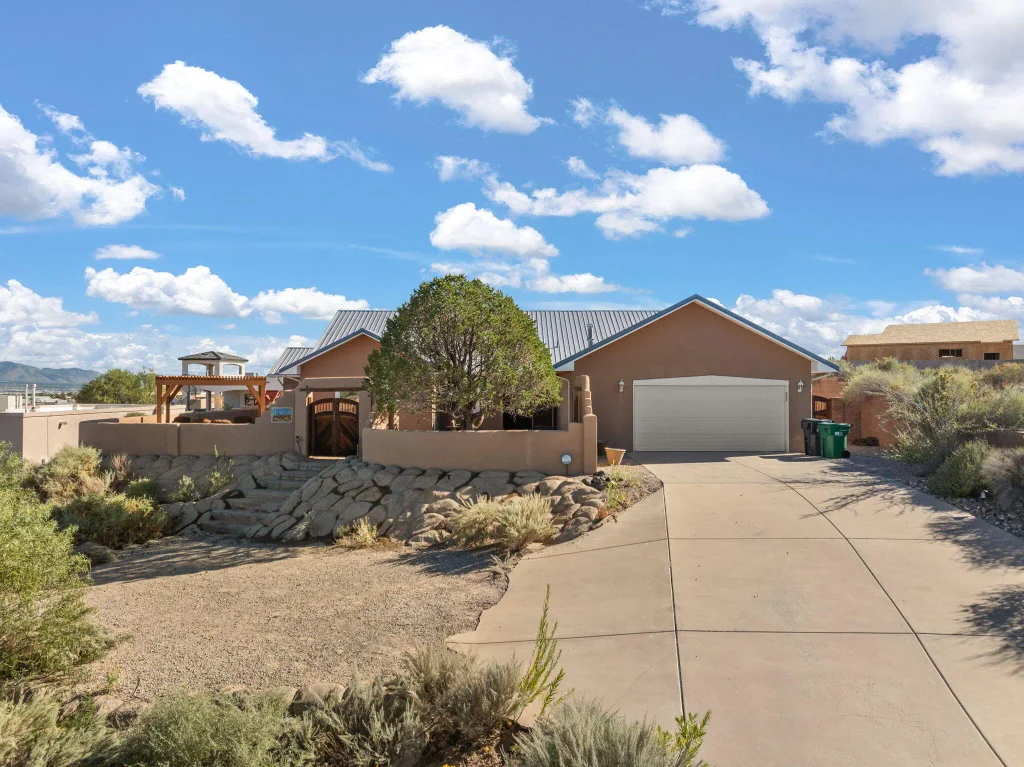 Beautiful One-Story Custom Home with Mountain Views!This 3bd, 2ba home sits on 0.51 acre with stunning Sandia views. Features include: metal roof, Pella doors, brand-new 2025 carpet, and a 6-year-old septic system. A welcoming courtyard opens to a family room with a kiva fireplace and a spacious eat-in kitchen with granite counters and ample cabinetry. The primary suite offers a walk-in closet and private bath, while two additional bedrooms share a full bath. Both the family room and primary bedroom connect to a covered patio, perfect for indoor-outdoor living. The walled backyard adds privacy and showcases incredible views with a pergola, storage shed, and covered patio. A two-car garage with workshop, attic storage, and concrete drive complete this thoughtfully designed proper