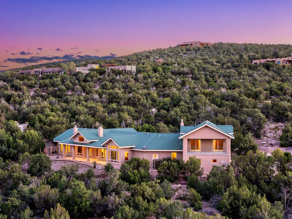 Welcome to 9 Canon Escondido in San Pedro Creek Estates. This single-owner residence, crafted by Crombie Construction, rests on over ten acres adjoining open space and captures magnificent views spanning more than 100 miles toward the Santa Fe Mountains. Expansive wood casement windows fill the home with light and warmth. The main level includes the primary suite plus kitchen, living, and dining areas along with two flex rooms ideal for office or studio. A lower guest suite features an ensuite bath, while upstairs offers two bedrooms, a sitting area, and a balcony with 360-degree views. Owned solar provides minimal electric costs, and a spacious three-car garage with added storage and a lower covered patio create the perfect place to relax, entertain, and enjoy endless mountain vistas.