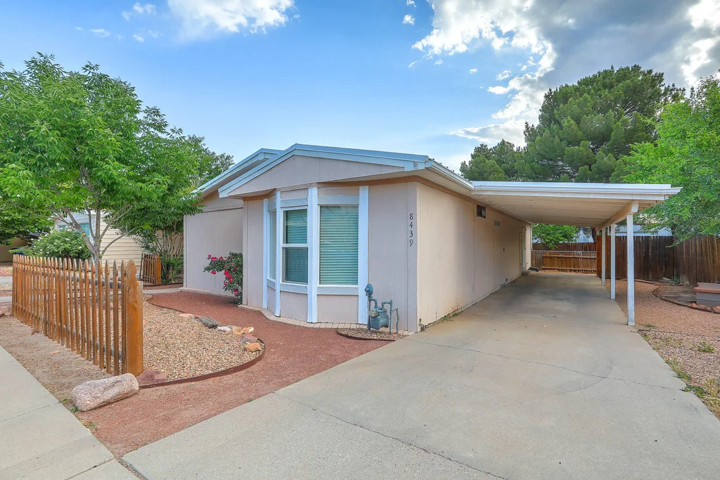 Great home in amazing location! This adorable 3 bedroom, 2 bath split floorplan home has had multiple upgrades over the years including: a newer furnace, newer cooling, metal roof,beautiful wood windows, solid wood floors in the main living area and maple cabinets. The home offers an open floorplan with large sit-at bar to kitchen and vaulted ceilings and 4skylights. Tons of natural light and a great outdoor space. 2 car, covered carport and covered deck out the back door. Easy landscaping, mature trees and a large shed for storage. Community swimming pool and a great location with easy access through Albuquerque and up to Santa Fe. Schedule a showing today!